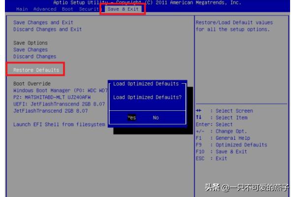 2、将光标移动到Save&Exit选项,然后选中下方的Restore Defaults即可.恢复默认设置后,点击F10键即可保存并退出BIOS界面。