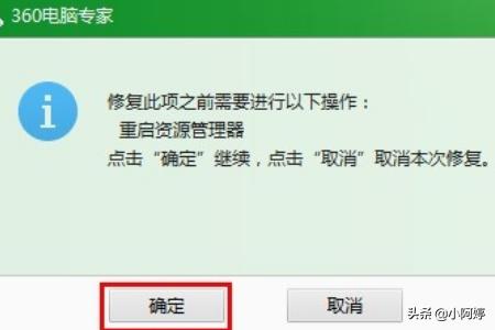 4、在接下来打开的“360电脑专家”警告窗口中点击“确定”按钮以重启“资源管理器”。