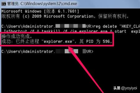 7、输入完成后,按Entet回车,很快有成功提示,然后会快捷重启资管理器,桌面会短时间消失又重现。
