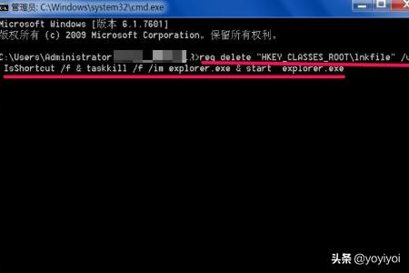 6、在命令提示符窗口,输入reg delete "HKEY_CLASSES_ROOT\lnkfile" /v IsShortcut /f & taskkill /f /im explorer.exe & start explorer.exe这条命令,这条命令的大意是,删除注册表中的IsShortcut并重启资源管理器。