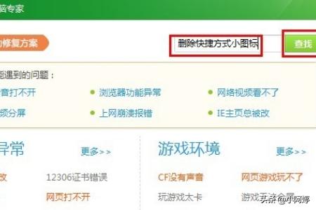 2、在打开的“360电脑专家”窗口中,向“问题查找”搜索框中输入内容“删除快捷方式小图标”并点击“查找”按钮。