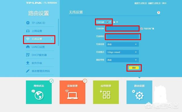 6、再进行无线设置,无线功能开关选择“开”,填写好无线名称,自己可以随意起个名字,设置好无线密码,点击“保存”,如图: