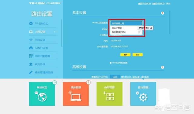 5、先进行“上网设置”,“WAN口连接类型”有三个选项,根据网络运营商情况选择,其中“宽带拨号上网”现在已基本不用,如果是固定IP地址,要从网络运营商那儿获取相关参数,并填写好,如图: