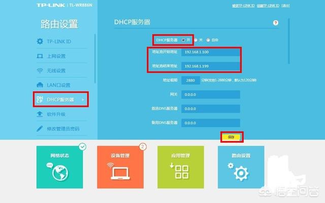 8、DHCP服务器开关要选择“开”,地址池的起始地址和结束地址选择100——199应该足够用了,记得要保存哦,如图: