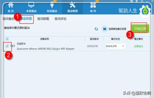 6、很快就将驱动卸载完毕,点击菜单栏的“驱动还原”,然后勾上“无线网卡”前面的勾,点击“开始还原”。