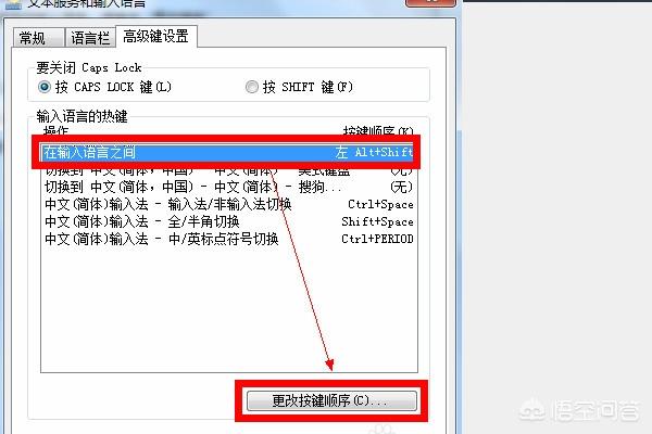 5、在文本服务和输入语言设置窗口里点击“高级键设置” ,选择第一个“在输入语言之间” 然后点击“更改按键顺序” 如图