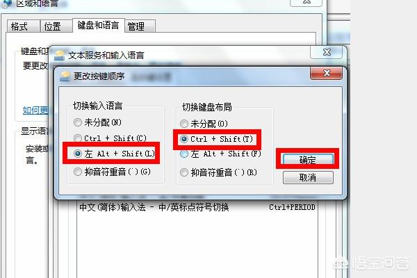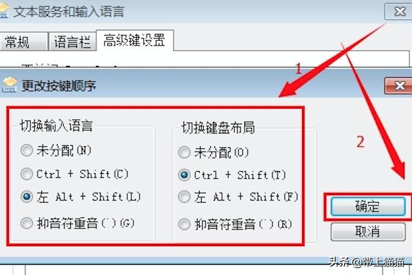 7、在弹出对话框里,根据你的习惯选择切换输入法的快捷键组合!选中后点击确定按钮。