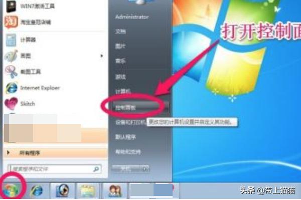 1、首先我们点击电脑左下角的圆形图标 然后点击“控制面板” 进入电脑的控制面板 如图