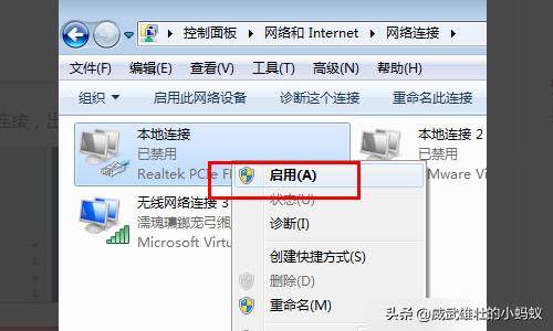5、如果被禁用了的本地连接是显示为灰色图标的,选择之后右键“启用”即可。