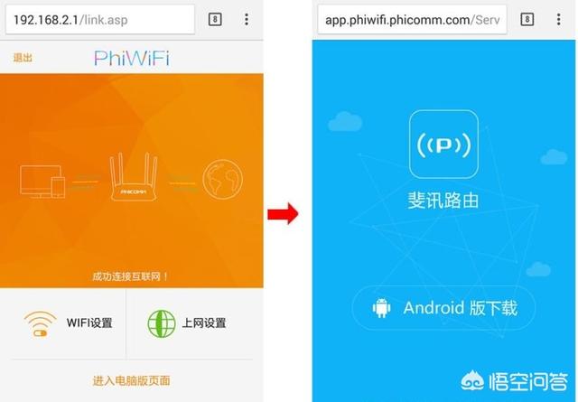 就这样,成功连接互联网了。然后浏览器会自动跳出下图中蓝色画面,在界面上可以直接下载Android版的APP软件”斐讯路由“。如果不下载,返回页面,点击最下方的:进入电脑版页面。