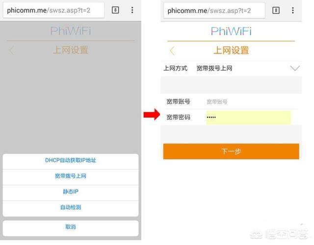 斐讯T1无线路由器设置中的广域网连接类型有三种,一种为静态IP、动态IP以及家庭最常用的拨号PPPoE等三种方式,一般我们家用都是拨号上网,因此选择PPPoE方式,然后点击下一步,如下图: