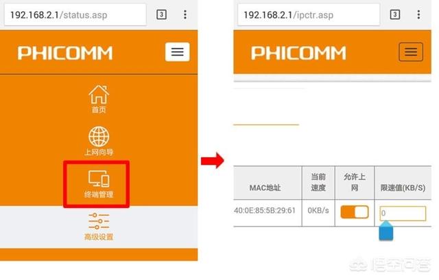 终端管理:这算是比较实用的功能,点开进去,可以查看所有已连接的设备,可以对其设备名称更改名称,可以设置允许或禁止上网,还可以设置限速,不过这个限速只对下载速度有作用,对上行速度没作用。测试了下,限制的速度还是比较准的。假如有人增网,直接对其禁止上网。