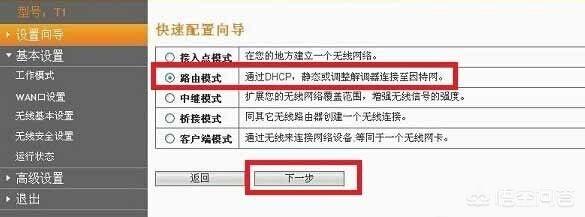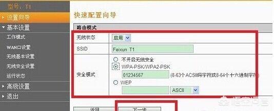 之后进入向导第一步,按照自己需求选择模式,一般都是选择路由模式然后点击下一步: 斐讯T1无线路由器设置中的广域网连接类型有三种,一种为静态IP、动态IP以及家庭最常用的拨号PPPoE等三种方式,一般我们家用都是拨号上网,因此选择PPPoE方式,然后点击下一步,: 在下面的上网帐号与上网口令里面分别填写上网络供应商提供给您的上网帐号与密码。