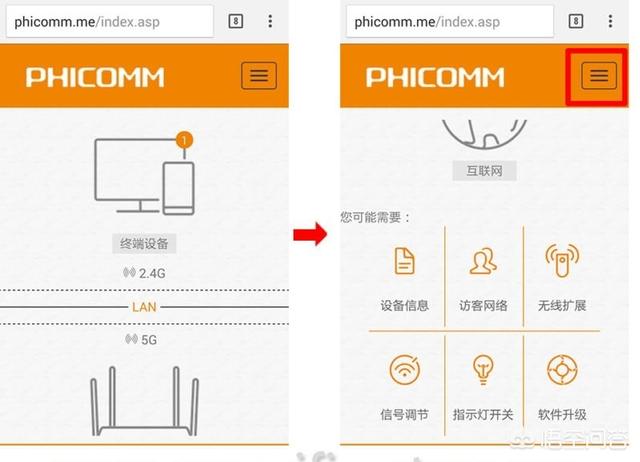 页面往下拉看见有六项常用功能菜单 :设备信息,访客网络,无线扩展,信号调节,指示灯开关,软件升级。