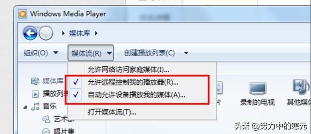 8、点击:允许远程控制我的播放器和 自动允许设备播放我的媒体这两项。并保持windows media player不要关闭, 在更多流选项中选择允许。