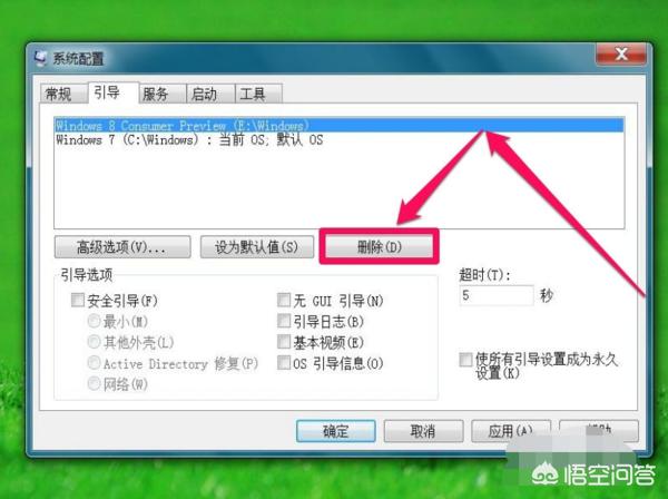 3、 在进入引导选项卡后,如果在你的电脑里,这里会显示多个win10系统的引导文件列表(我这里只有1个win7和一个win8的引导文件),现在我希望删除多余的win8引导文件,就可在这里直接选中该条记录,然后点击“删除”按钮。