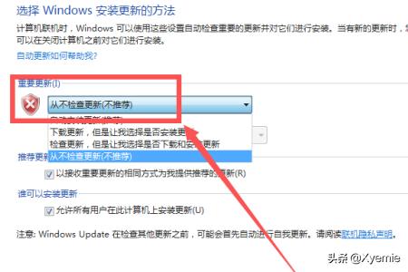 4、打开选择Windows安装更新的方法界面,选择【从不检查更新】项。