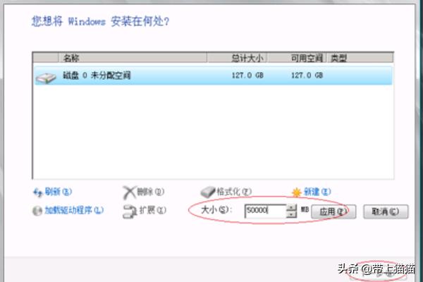 8、第八步 分配磁盘分区大小,点击应用。当然硬盘够大分区容量还可扩大,建议至少分配50G。