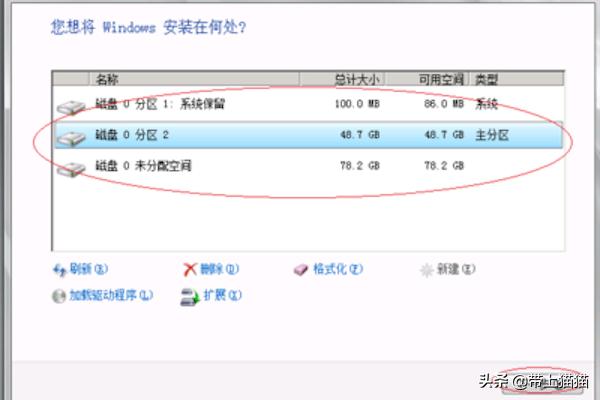 9、第九步 选择安装Windows Server 2008 R2 x64企业版的分区,一般都是选择第二个分区即C:盘,第一个分区为系统保留分区。如图,选择完毕点击下一步。