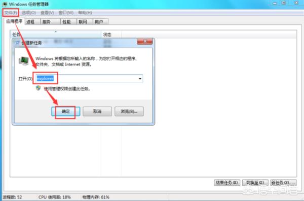 4.这时会出现创建任务栏,在打开框中输入“explorer”,点击确定(如下图):