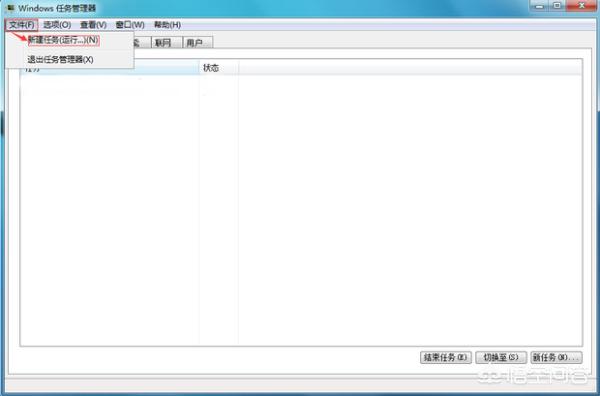 3.这时会出现任务管理器窗口,在左上角点击“文件”项,再点击上面“新建任务(运行..)(N)”(如下图):
